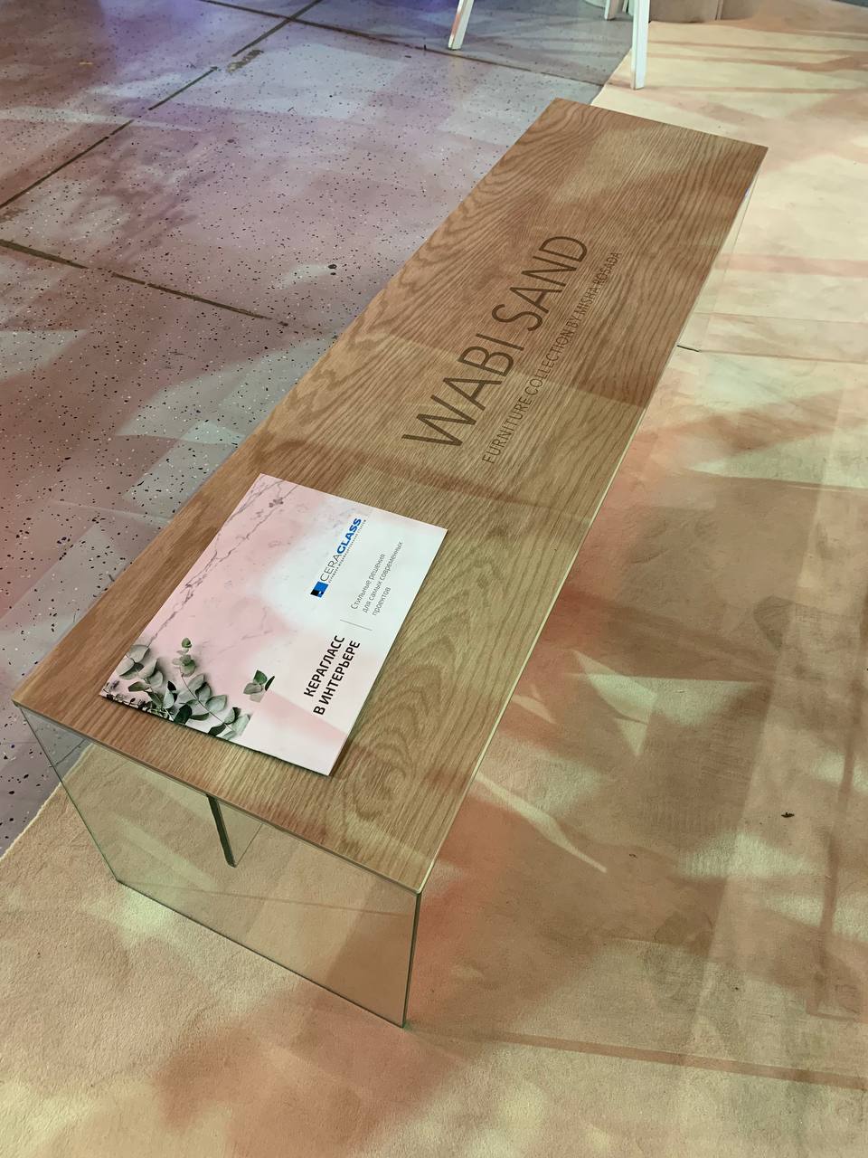 Скамья же имеет поверхность из керамики под дерево и основание из закаленного прозрачного стекла. Это уникальное изделие спроектировано известным российским архитектором и дизайнером Михаилом Росада, о чем свидетельствует гравировка на поверхности.